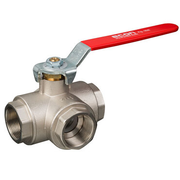 Válvula de bola de 3 vías ECON 1635, fabricada en latón niquelado con construcción horizontal. Conexión rosca interna BSPP según EN-ISO 228-1. Disponible con paso en T o en L, con un ángulo de giro de 90°. Presión PN32 en tamaños de 1/4″ a 1″ y PN25 en 1.1/4″ a 2″, con temperaturas de -20°C a +150°C. Diseñada para sistemas de distribución en HVAC, agua y aire comprimido.