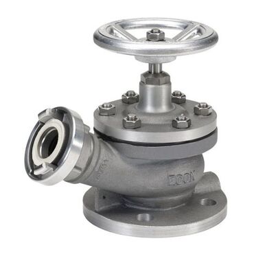 Válvula para sistemas contra incendios ECON® tipo 2057LM de construcción inclinada, fabricada en aluminio (material G-AlMgSi3). Conexión de brida y acoplamiento Storz, con acabado de brida de cara plana. Opera en un rango de temperaturas continuas desde -10 °C hasta 80 °C, soporta una presión máxima de 10 bar a 20 °C.