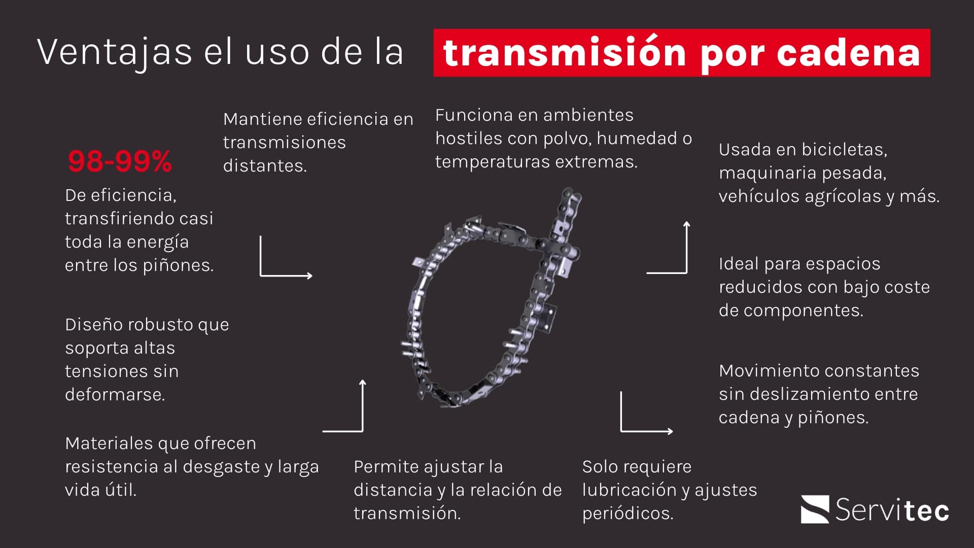 Parece que la transmisión por cadena ha llegado para quedarse, ya que sus beneficios y la infinidad de aplicaciones, especialmente en el sector de maquinaria industrial, parecen no tener fin. En Servitec somos conscientes de ello, y por eso llevamos dedicando durante más de 30 años todos nuestros esfuerzos a la distribución industrial.